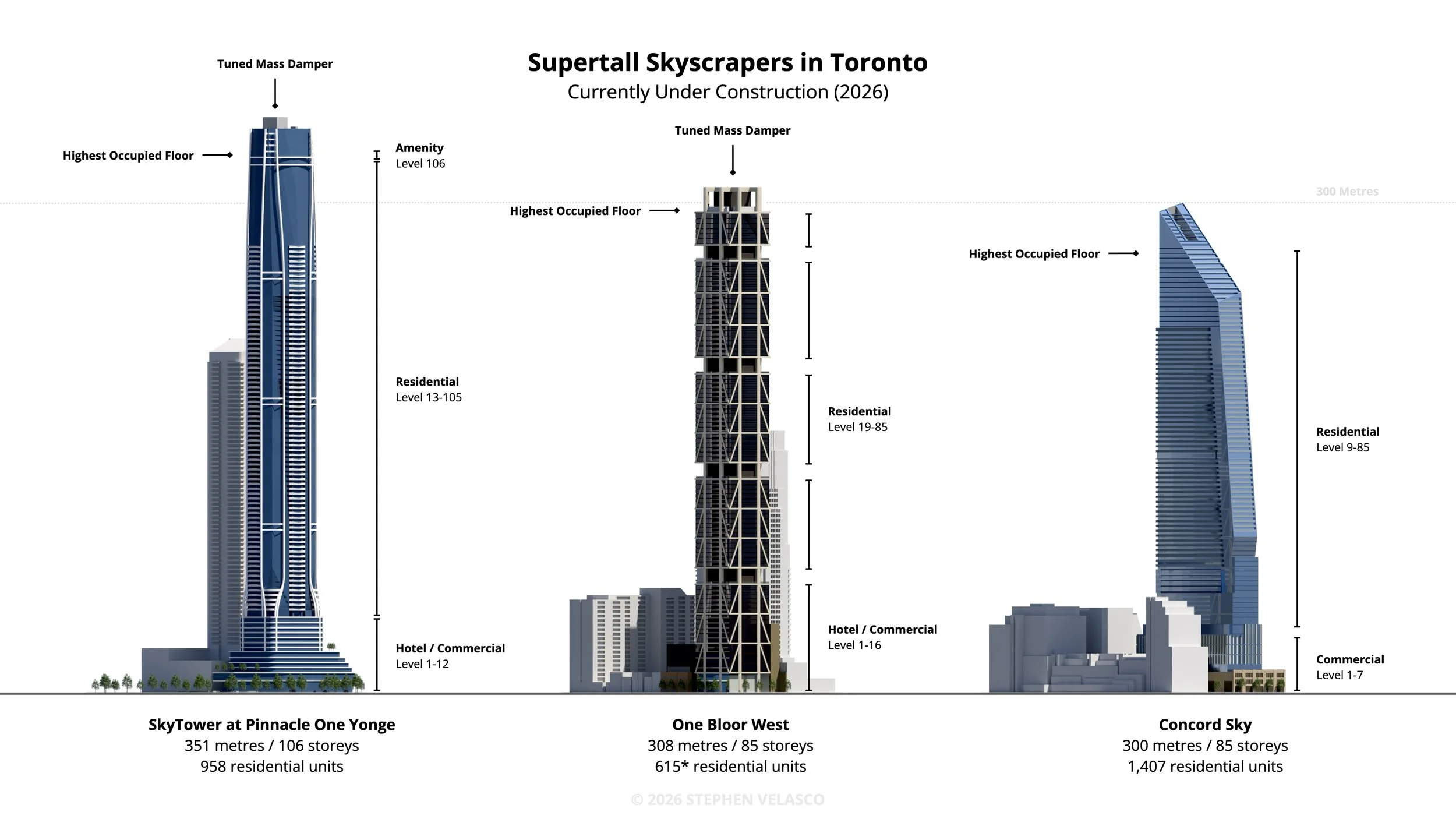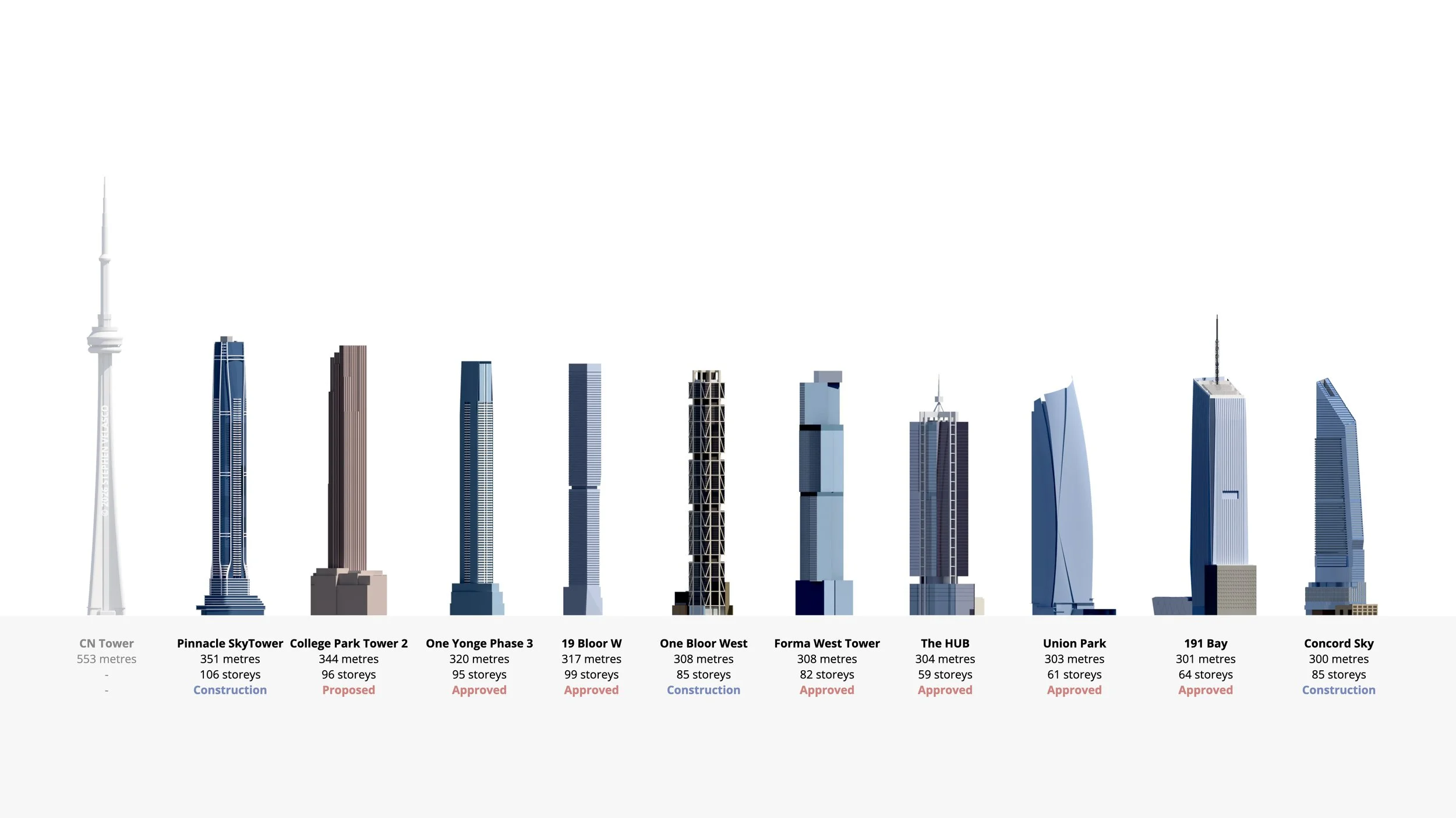 3 Supertall Skyscrapers (buildings 300m+) are under construction in Toronto — an additional 7 are proposed or approved.